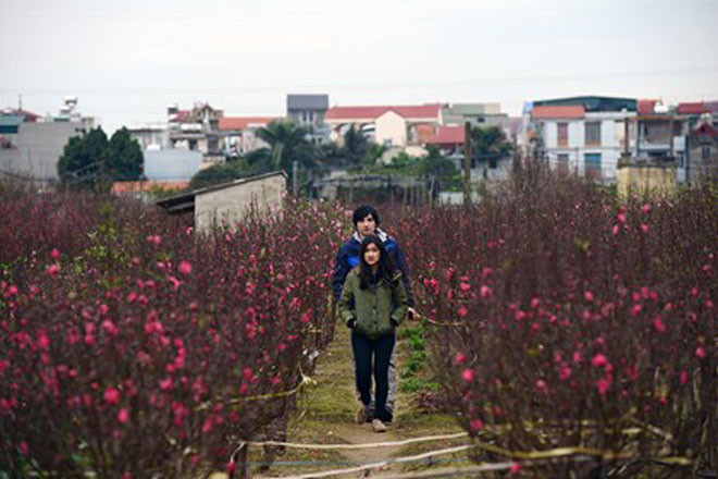 Đôi bạn trẻ xuống tận vườn đào Nhật Tân để chọn một cành đào ưng ý.