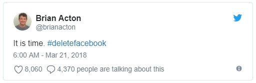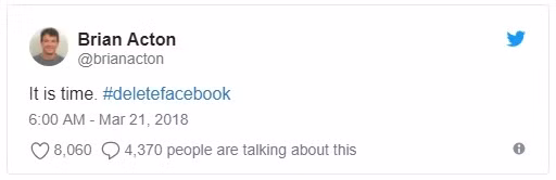“Đã đến lúc #deletefacebook”, dòng trạng thái được ông Acton chia sẻ trên Twitter.