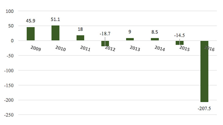 Kết thúc năm 2016, Sông Đà 7 lỗ 207,6 tỷ đồng, trong đó riêng quý IV lỗ tới 121,6 tỷ đồng. Nhìn vào kết quả kinh doanh từ khi thành lập đến nay có thể thấy, năm 2016 là một năm làm ăn “bết bát” đối với doanh nghiệp này.