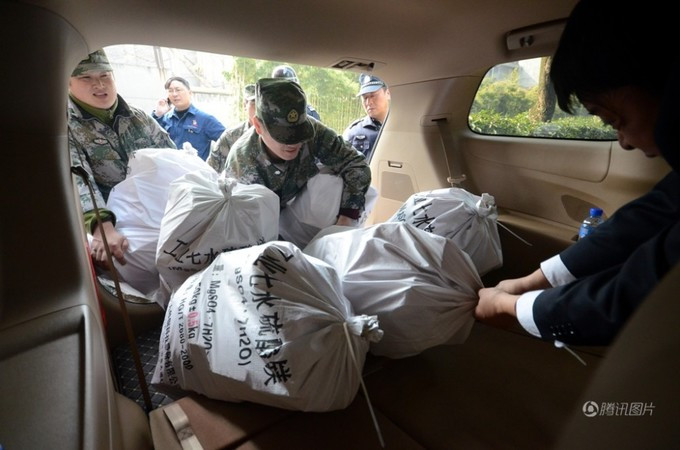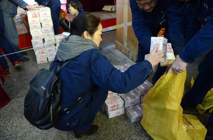 Vì tiền Trung Quốc mệnh giá to nhất là 100 đồng, nên 32.000 tệ được xếp thành 32 cọc lớn cho vào bao tải.