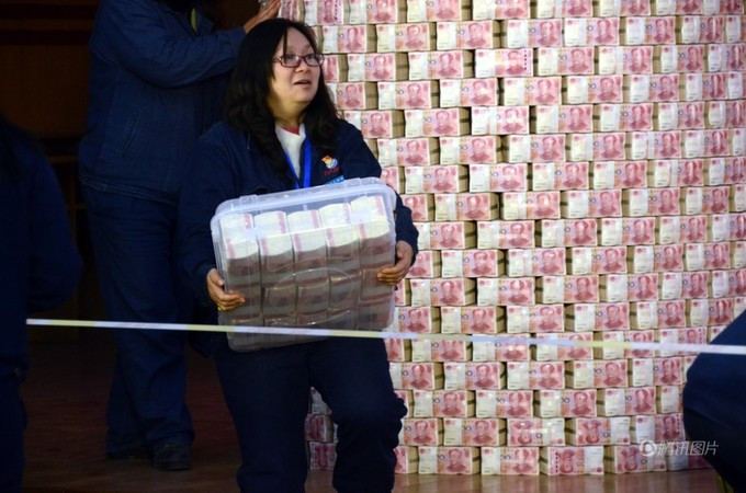 160 triệu tệ được xếp thành một bức tường tiền lớn.