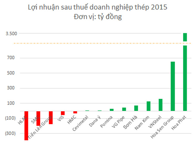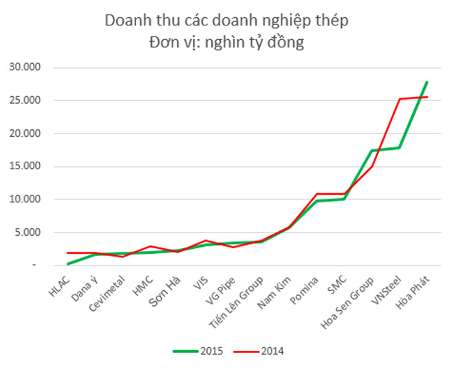 Trong các doanh nghiệp thép niêm yết trên 2 sàn và upcom, Hòa Phát xứng đáng giữ ngôi vị số 1 ngành thép với doanh thu gần 28 nghìn tỷ đồng trong năm 2015 (trong đó mảng thép đóng góp 22 nghìn tỷ) - bỏ xa so với hai doanh nghiệp lớn khác là Tổng Công ty Thép Việt Nam (VnSteel- TVN) và Hoa Sen Group (HSG). Doanh thu của VNSteel giảm đáng kể khi CTCP Gang thép Thái Nguyên - Tisco không còn là công ty con.