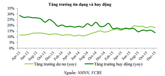 Về tín dụng năm 2016, VCBS dự báo tăng trưởng 16%, thấp hơn 2015 do tín dụng sẽ hướng tập trung hơn vào khu vực sản xuất-kinh doanh trong khi tín dụng cho hoạt động xây dựng, BOT và mua bất động sản có thể sẽ chững lại (sau khi đã diễn ra rất sôi động trong năm 2015 khi kinh tế hồi phục).