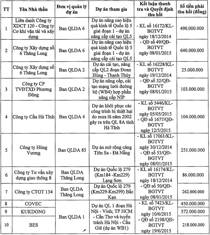 Ba nhà thầu tham gia Dự án QL1 đoạn Hà Nội - Vinh; TP.HCM - Cần Thơ và tuyến tránh Hà Nội - Cầu Giẽ - Dự án WB1 có mặt trong Danh sách là COVEC, KUKDONG và BES, với số tiền phải thu hồi lần lượt là 450 triệu đồng, 372 triệu đồng và 218 triệu đồng. Ngoài ra, còn có nhà thầu Công ty CTGT 134 tham gia Dự án QL 279 (Km 229 - Km299) Bắc Kạn với số tiền phải thu hồi là 262 triệu đồng…