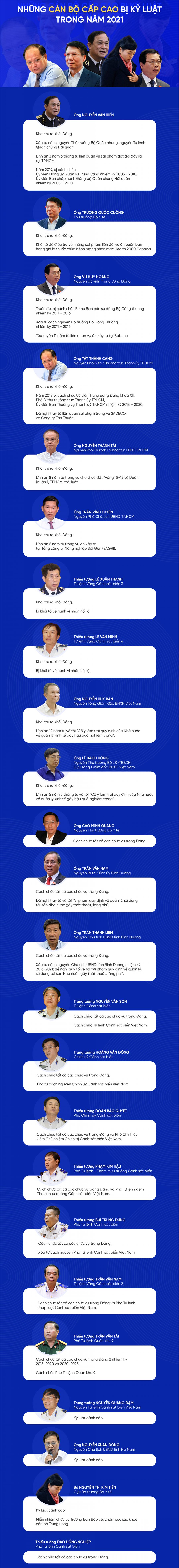 Công tác kiểm tra, giám sát, kỷ luật Đảng tiếp tục được siết chặt khi năm 2021, hàng loạt cán bộ cấp cao đương chức và nghỉ hưu bị xử lý vì sai phạm trong quá trình công tác.