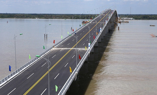 Cầu Cổ Chiên. Ngày 16/5, cầu Cổ Chiên nối tỉnh Trà Vinh và Bến Tre được hoàn thành, xóa cảnh đi đò nhiều năm của người dân hai bờ sông. Cầu dài gần 1,6 km, rộng 16m, quy mô 4 làn xe, tốc độ thiết kế 80 km/h với tổng mức đầu tư 2.308 tỷ đồng. Đây là một trong 4 cầu lớn trên quốc lộ 60 và là điểm kết nối quan trọng giữa quốc lộ này với các tuyến đường thuộc hành lang duyên hải phía đông đồng bằng sông Cửu Long (Tiền Giang, Bến Tre, Trà Vinh, Sóc Trăng). Công trình đưa vào sử dụng đã rút ngắn hành trình 70 km từ TP HCM đến Trà Vinh, Sóc Trăng. “Cây cầu này là niềm mong mỏi bao đời của người dân Trà Vinh”, ông Đồng Văn Lâm, Chủ tịch UBND tỉnh Trà Vinh nói. Ảnh: Cửu Long