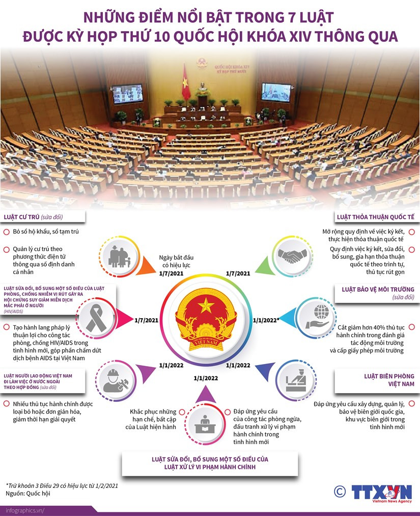 Tại Kỳ họp thứ 10, Quốc hội khóa XIV đã thông qua 7 luật gồm: Luật Cư trú (sửa đổi), Luật Thỏa thuận quốc tế, Luật Biên phòng Việt Nam, Luật Bảo vệ môi trường (sửa đổi), Luật Người lao động Việt Nam ở nước ngoài, Luật Xử lý vi phạm hành chính và Luật phòng chống nhiễm virus gây ra hội chứng suy giảm miễn dịch mắc phải ở người./.
