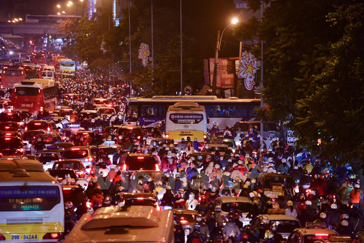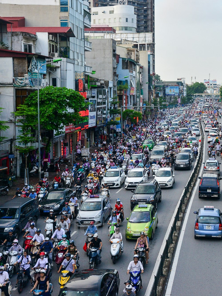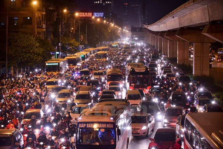 Các trục đường chính vào Thủ đô như Cầu Giấy, Giải Phóng, Trường Chinh, Đại Cồ Việt,... lúc nào cũng trong tình trạng ùn ứ, tắc nghẽn. (Ảnh: PV/Vietnam+)