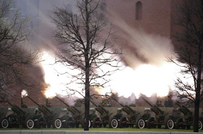 Mở đầu lễ duyệt binh, các khẩu đại bác đồng loạt khai hỏa giữa tiếng quốc ca Nga hùng tráng, được coi là một trong những khoảnh khắc ấn tượng nhất trong buổi lễ.