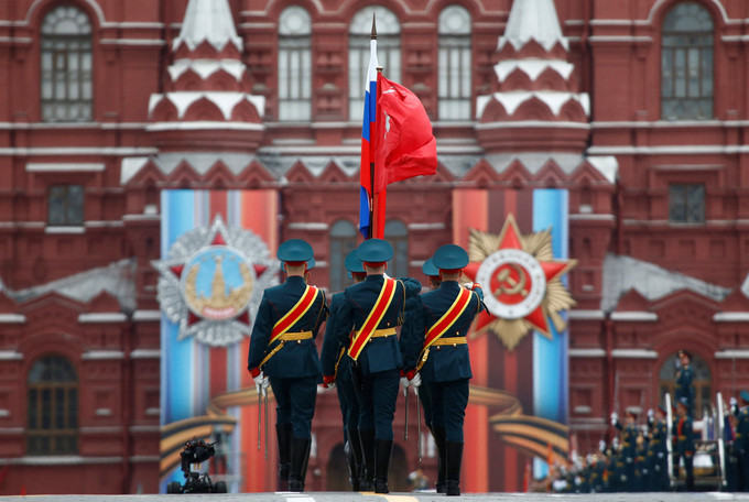 Các sĩ quan Trung đoàn Cận vệ Độc lập số 154 Preobrazensky mang quốc kỳ Liên bang Nga và Quân kỳ Quyết thắng dẫn đầu các khối duyệt binh tiến qua Quảng trường Đỏ.