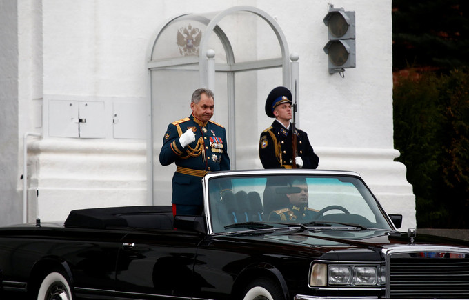 Bộ trưởng Quốc phòng Nga Sergei Shoigu đứng trên xe cầu nguyện trước khi bắt đầu duyệt đội hình các khối duyệt binh.