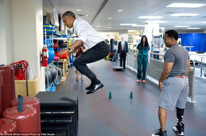 Ông Obama mặc âu phục tham gia một buổi tập phản xạ nhanh với Thiếu tá Hải quân John Jae Terry tại Trung tâm y tế quân sự quốc gia Walter Reed, nơi ông tới thăm đều đặn trong suốt 2 nhiệm kỳ tổng thống.