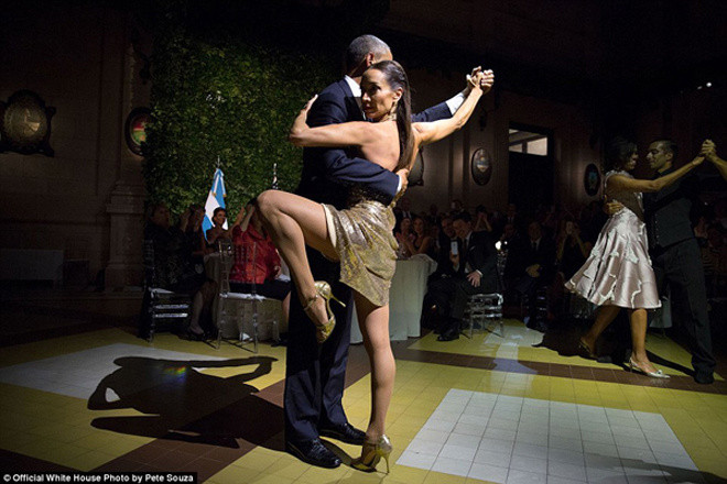 Ông Obama nhảy điệu tango với vũ công chuyên nghiệp trong tiệc tối do Tổng thống Argentina Mauricio Macri tổ chức ở thủ đô Buenos Aires.