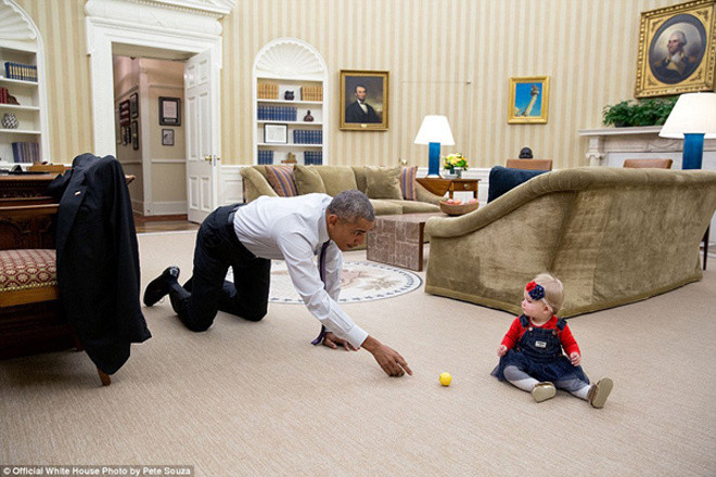 Ông Obama bò quanh Phòng Bầu dục với con gái của Giám đốc Truyền thông Jen Psaki. Theo Souza, tổng thống Mỹ thường đề nghị các nhân viên cấp dưới đưa con cái họ tới Nhà Trắng.