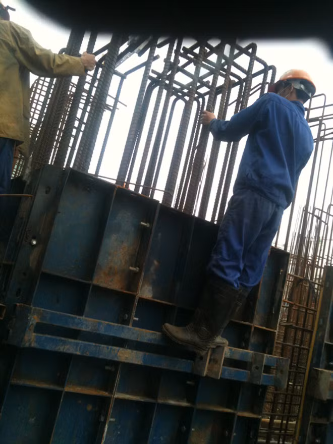 Công nhân thi công kết cấu thép cho trụ nhưng không có giàn giáo, không thắt dây an toàn như quy định