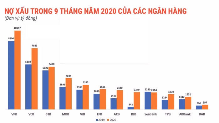 Xu hướng tăng nợ xấu còn thể hiện trên các ngân hàng khác như tại MBB tăng 39,2%; SaiGonBank tăng 4,3%; KienLongBank tăng 555%; VIB tăng 26%...