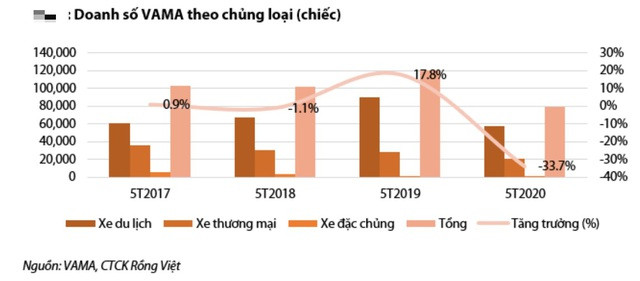 Thống kê của Hiệp hội ô tô Việt Nam (VAMA) công bố gần đây cho thấy, doanh số bán hàng của các thành viên cho đến hết tháng 5/2020 đã giảm 34% so cùng kỳ, xuống còn 79.396 chiếc.