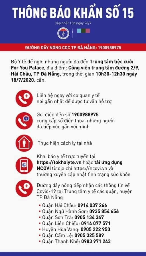 Ngày 18/7/2020, bệnh nhân có đi đám cưới cháu ruột của vợ tại Trung tâm Tiệc cưới và Hội nghị For You Palace (Đường 2/9, phường Hòa Cường Bắc, quận Hải Châu, thành phố Đà Nẵng).