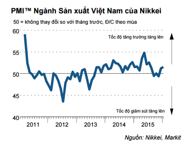 Nikkei vừa công bố chỉ số PMI ngành sản xuất Việt Nam tháng 1/2016. Theo đó, trong tháng đầu năm 2016, chỉ số PMI ngành sản xuất đã tăng từ mức 51,3 điểm của tháng trước lên 51,5 điểm.