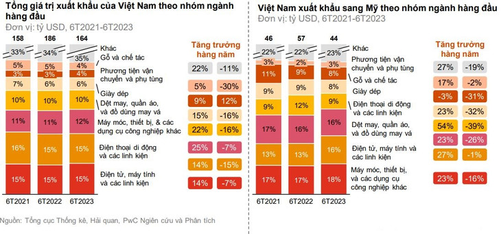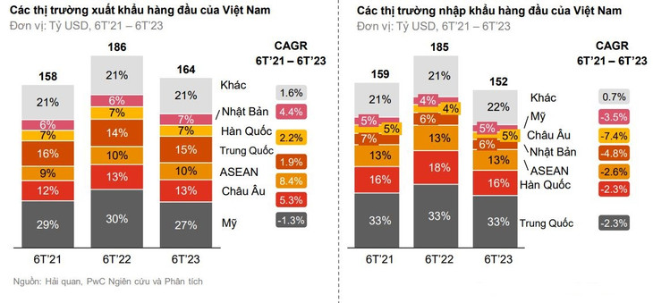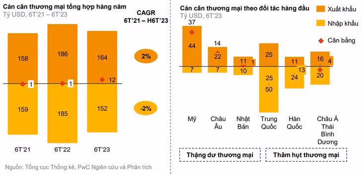 Trong nửa đầu năm 2023, mặc dù xuất siêu 12,1 triệu USD nhưng tổng giá trị xuất khẩu giảm khoảng 12% so với cùng kỳ năm ngoái. Ngoại trừ nông nghiệp, hóa chất, sản phẩm giấy và phương tiện vận tải/phụ tùng, hầu hết các lĩnh vực đều có xuất khẩu hàng hóa giảm từ 10 - 20% so với cùng kỳ. Xuất khẩu chững lại do ảnh hưởng bởi sức tiêu thụ tại các thị trường xuất khẩu chính giảm (mức giảm giá trị xuất khẩu của Mỹ, Hàn Quốc, EU và ASEAN lần lượt là 22%, 10%, 10% và 9% so với cùng kỳ). Mỹ vẫn là thị trường xuất khẩu hàng đầu của Việt Nam, chiếm khoảng 30% tổng kim ngạch xuất khẩu.