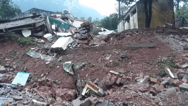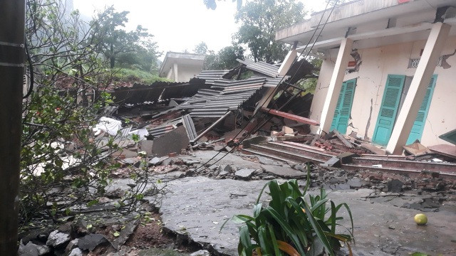 | Nhiều dãy nhà tại Đồn biên phòng Cửa khẩu quốc tế Cha Lo đã đổ sập vì sự cố sạt lở đất. |