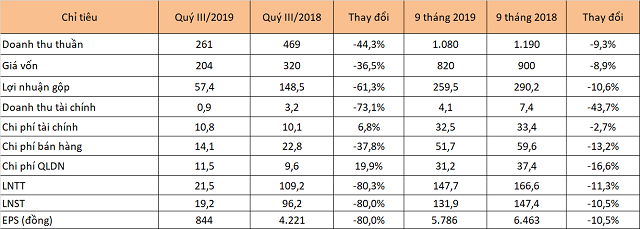 Sự sụt giảm doanh số dẫn đến chi phí bán hàng giảm 38%; trong khi đó chi phí bán hàng và chi phí lãi vay gia tăng. Kết quả, doanh nghiệp báo lãi giảm 80% còn 19 tỷ đồng.