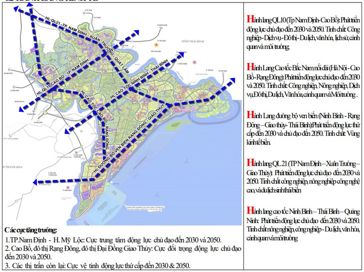 Về không gian lãnh thổ, Nam Định định hướng phát triển 4 trung tâm đô thị gồm: Đô thị trung tâm Tỉnh (TP. Nam Định và thị trấn Mỹ Lộc); Đô thị Cao Bồ; Đô thị Rạng Đông -Thịnh Long và Đô thị Giao Thủy (thị trấn Ngô Đồng, Đô thị Đại Đồng). 5 hành lang kinh tế động lực chủ đạo gồm: hành lang Quốc lộ 10 (TP. Nam Định - Cao Bồ); hành lang cao tốc Bắc - Nam nối dài (Hà Nội - Cao Bồ - Rạng Đông); hành lang quốc lộ ven biển (Ninh Bình - Rạng Đông - Giao thủy - Thái Bình); hành lang TP. Nam Định - Lạc quần -Giao thủy; hành lang cao tốc Ninh Bình - Thái Bình - Quảng Ninh.