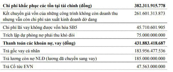 Quay trở lại với thông tin bán Dự án Thủy điện Sông Bung 5, theo tính toán của Công ty TNHH Hãng Kiểm toán AASC, giá khởi điểm chào bán là 1.688 tỷ đồng. Giá trị thanh toán sẽ là giá bán đấu giá thành công trừ tổng giá trị khoản nợ vay của Dự án. PECC1 ước tính thu nhập sau thanh toán công nợ là hơn 885 tỷ đồng. PECC1 cho rằng, tiền thu được từ bán Dự án là yếu tố tiên quyết để khắc phục tình trạng tài chính hiện tại và thanh toán khoản nợ vay tồn tại từ nhiều năm trước như nợ lương người lao động, vay cá nhân/vay đầu tư, nợ cổ tức EVN... (xem bảng)