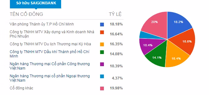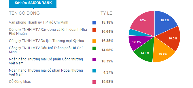Hiện nay, các cổ đông lớn của Saigonbank chiếm tỷ lệ trên 80% vốn điều lệ của ngân hàng này (bao gồm cả Vietcombank là 4,37%). Tỷ lệ cổ đông nhỏ lẻ chiếm khá thấp, tỷ lệ 19,98%.