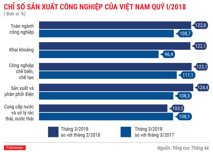 Theo báo cáo Tình hình kinh tế - xã hội của Tổng cục Thống kê, tháng 3, chỉ số sản xuất công nghiệp (IIP) cả nước tăng 8,7% so với cùng kỳ năm trước. Tính chung quý 1/2018, IIP tăng 11,6% - gấp đôi mức tăng 5,1% của cùng kỳ 2017.