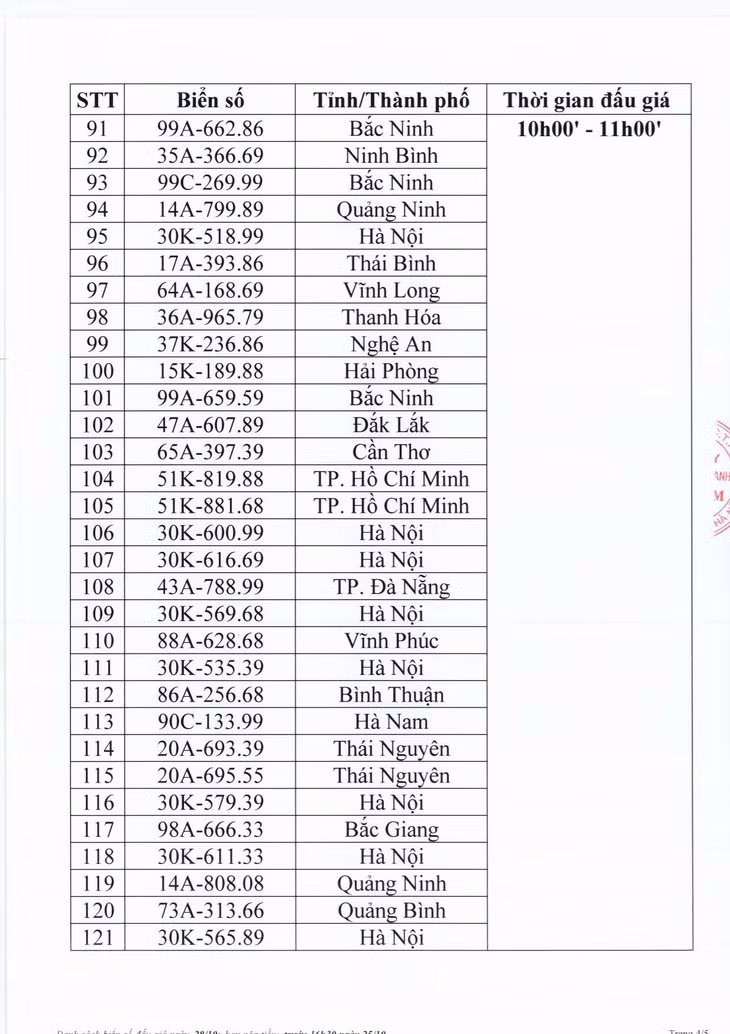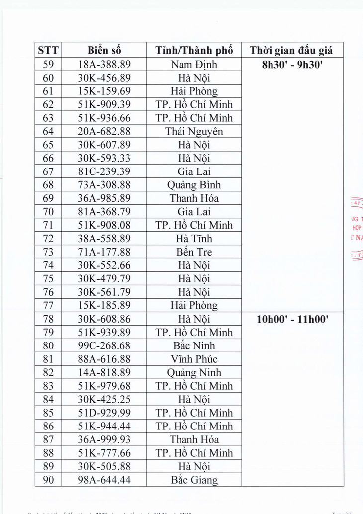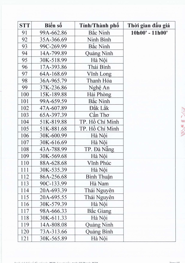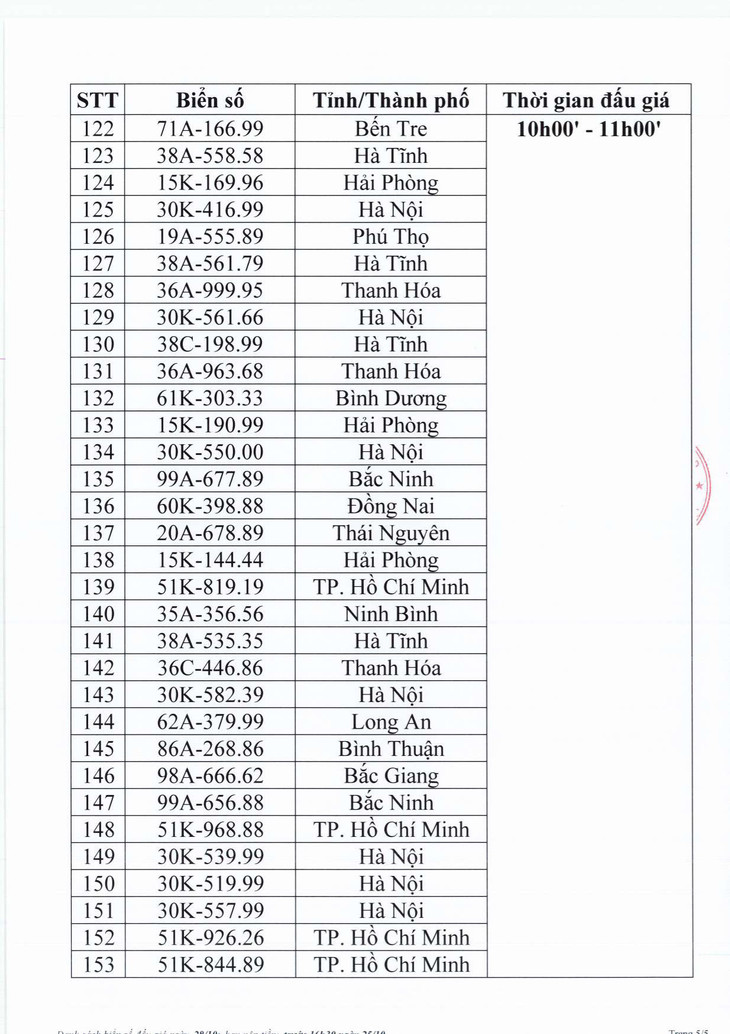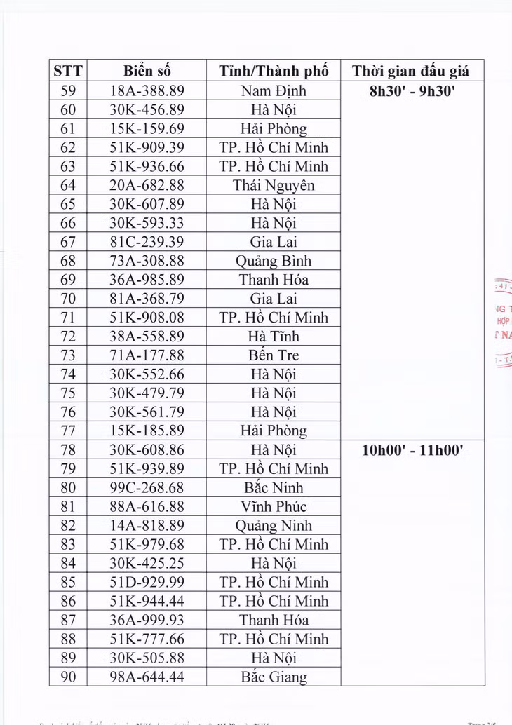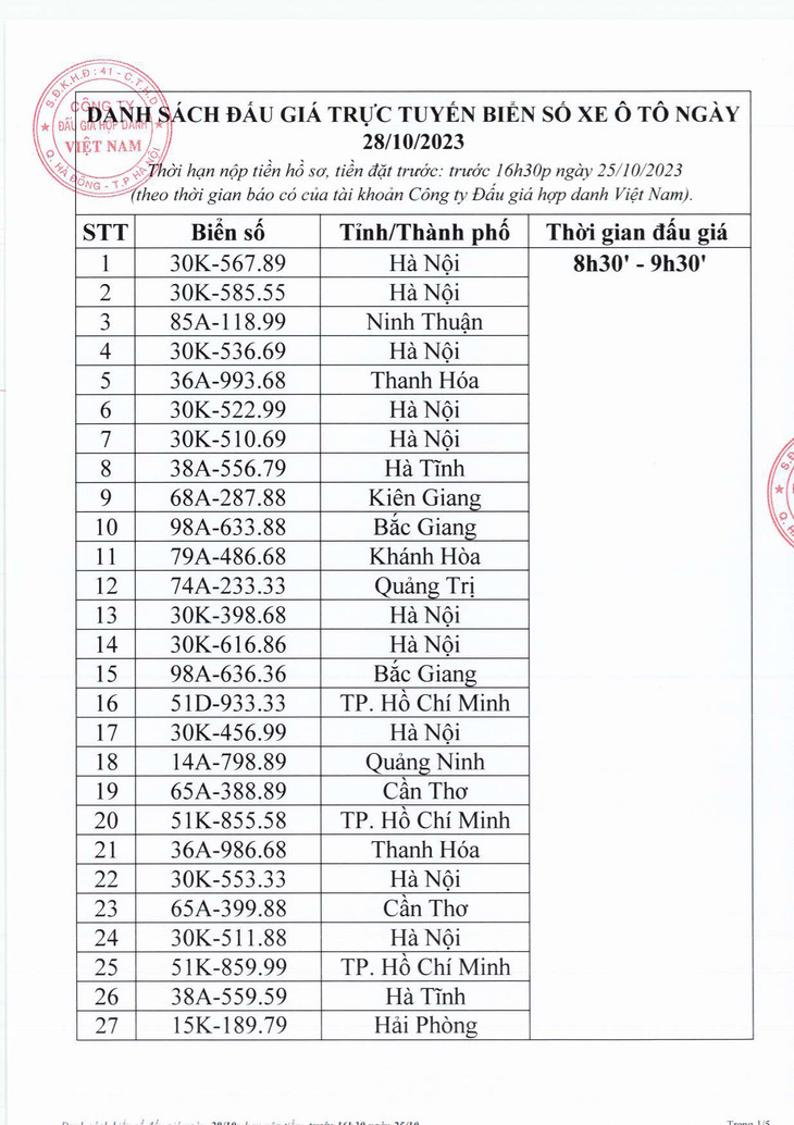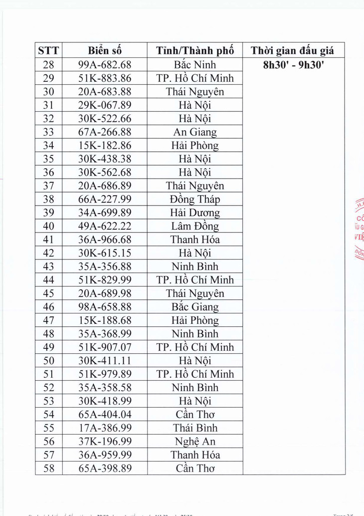 Sau đây là danh sách biển số ô tô và các phiên đấu giá trực tuyến ngày 28/10: