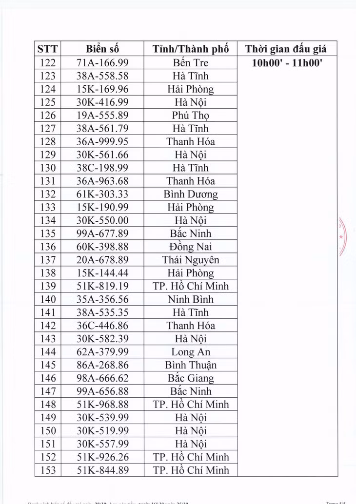 Công ty Đấu giá hợp danh Việt Nam (VPA) thông báo danh sách đấu giá trực tuyến biển số xe ô tô ngày 28/10. Theo đó, sẽ có 153 biển số lên sàn đấu giá vào sáng 28/10. Các phiên đấu giá biển số ô tô sẽ được tổ chức tại 2 khung giờ (8h30 - 9h30, 10h00 - 11h00).