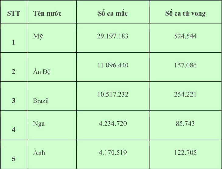 5 quốc gia có số ca mắc Covid-19 nhiều nhất thế giới gồm: