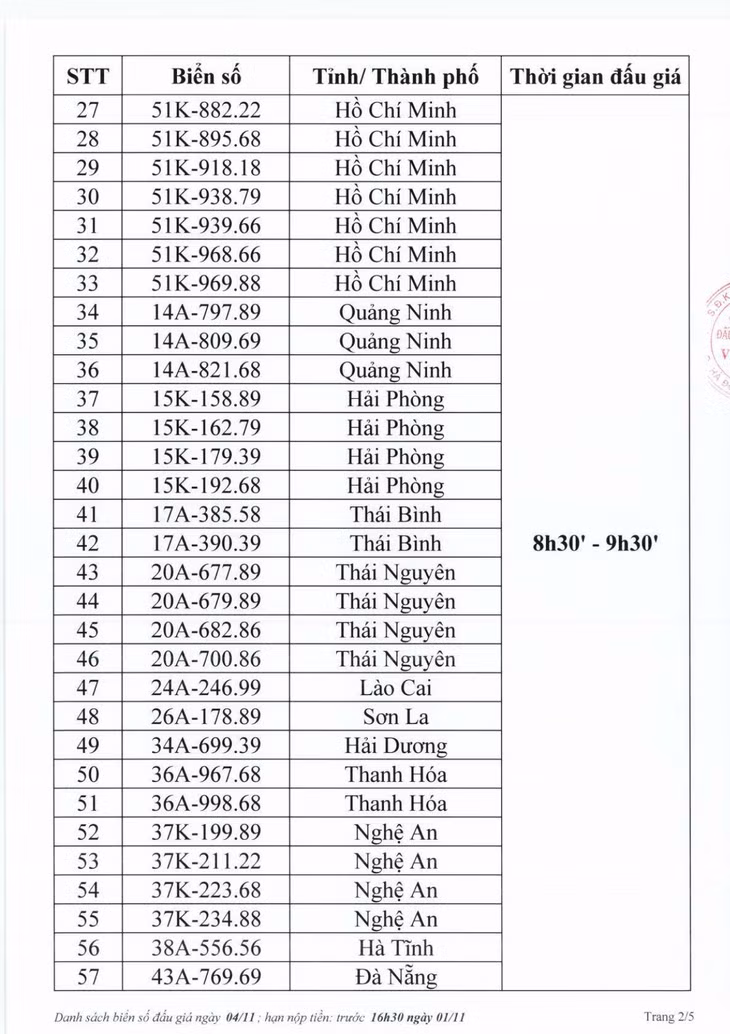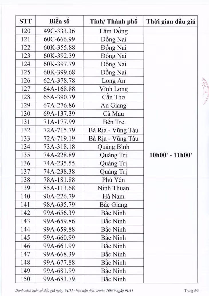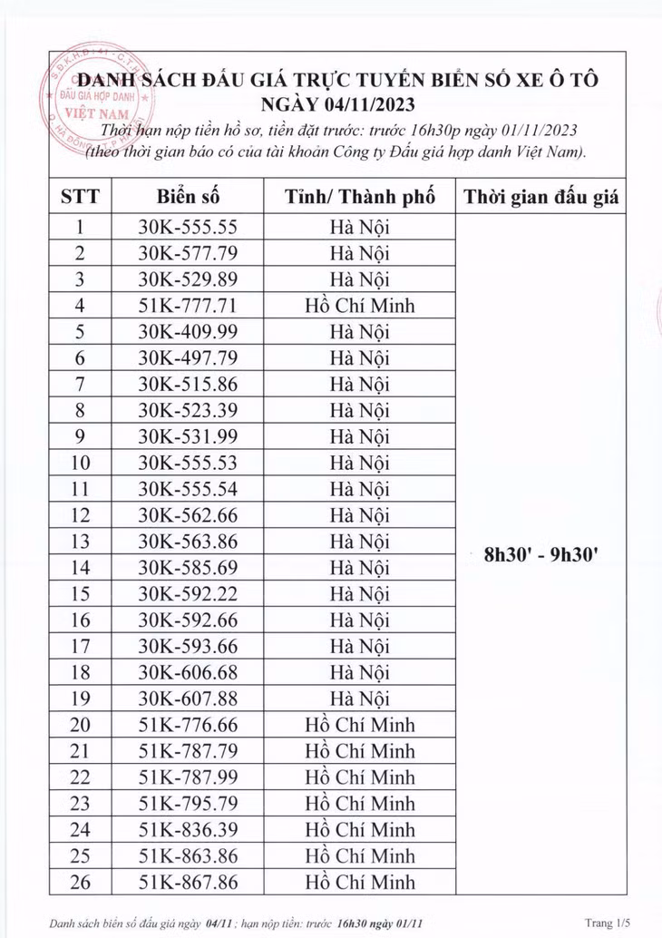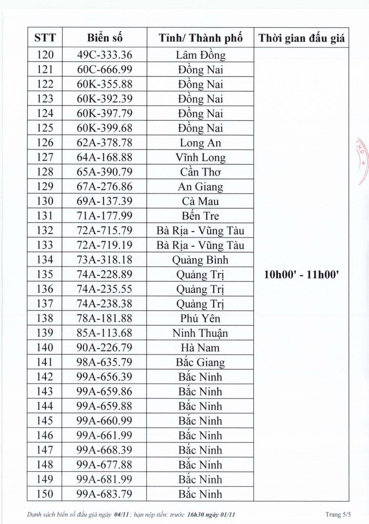 Công ty Đấu giá hợp danh Việt Nam (VPA) thông báo danh sách đấu giá trực tuyến biển số xe ô tô sáng 4/1. Theo đó, sẽ có 150 biển số lên sàn đấu giá vào 2 khung giờ (8h30 - 9h30, 10h00 - 11h00).