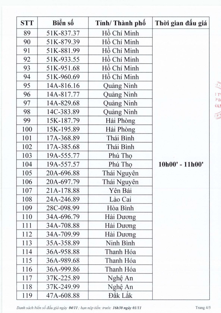 Sau đây là danh sách biển số ô tô và các phiên đấu giá trực tuyến ngày 4/1: