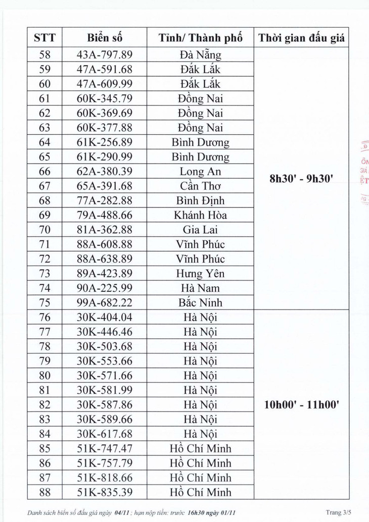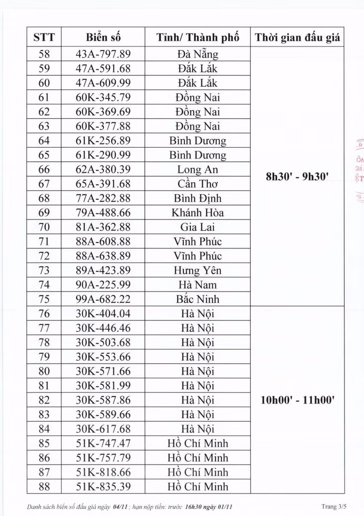 Phiên đấu giá biển số chiều 3/11 có 255 biển số được đưa lên "sàn" vào 2 khung giờ là 13h30 - 14h30 và 15h00 - 16h00. Ở khung giờ đầu tiên (13h30 - 14h30), giá trúng khá thấp.