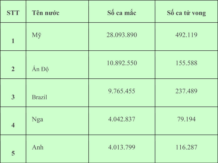 5 quốc gia có số ca mắc COVID-19 nhiều nhất thế giới gồm: