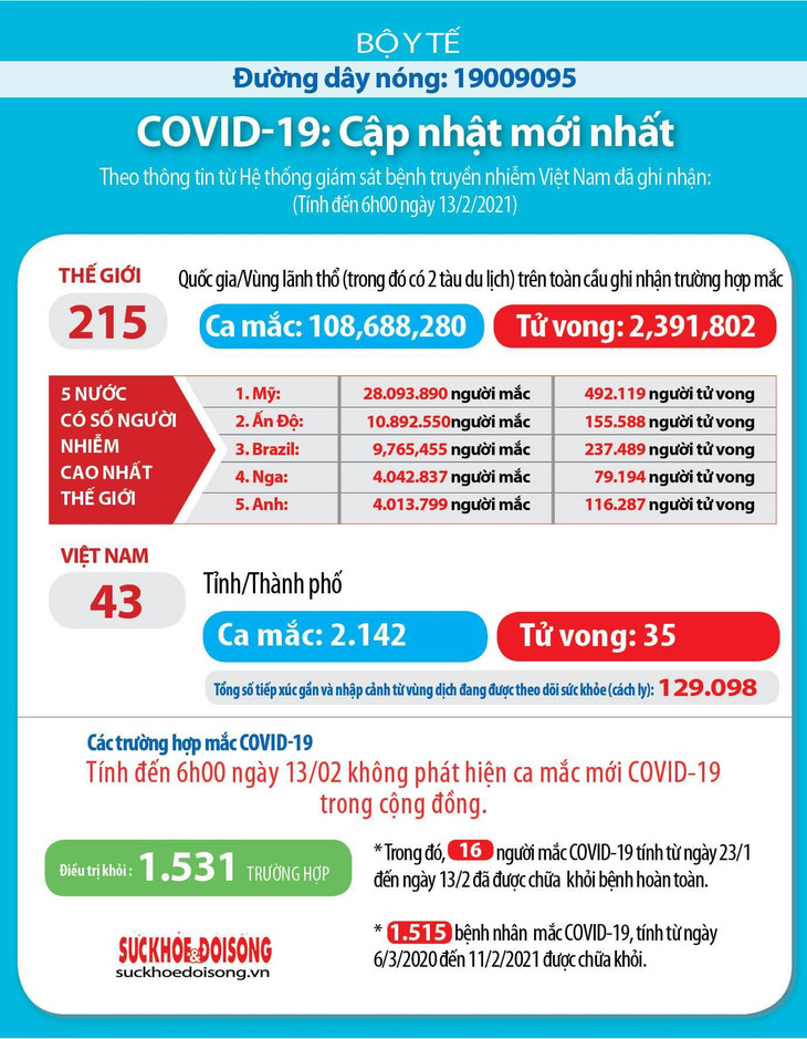 Số ca mắc ở Việt Nam: Tính đến 6h ngày 13/02, Việt Nam có tổng cộng 1.248 ca mắc COVID-19 do lây nhiễm trong nước, trong đó số lượng ca mắc mới tính từ ngày 27/1 đến nay là 555 ca. Tính từ 18h ngày 12/02 đến 6h ngày 13/02 không có ca mắc mới.