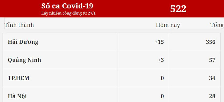 - Tính đến 6h ngày 11/02, Việt Nam có tổng cộng 1.215 ca mắc COVID-19 do lây nhiễm trong nước, trong đó số lượng ca mắc mới tính từ ngày 27/1 đến nay là 522 ca.