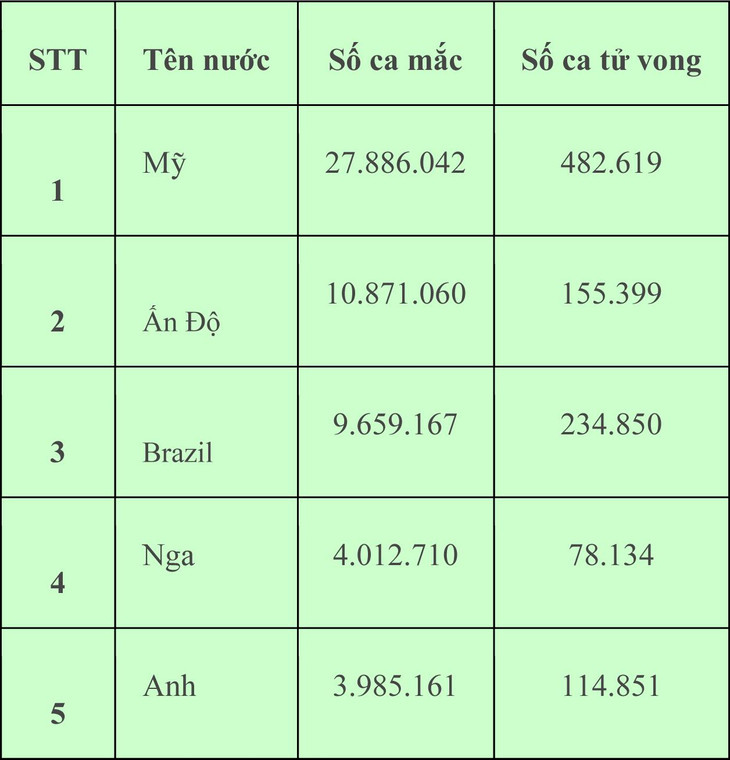 5 quốc gia có số ca mắc COVID-19 nhiều nhất thế giới gồm: