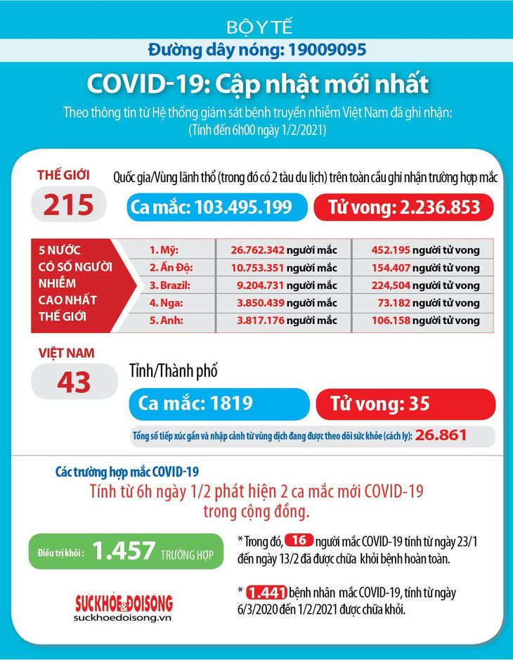 Thế giới: 103.495.199 người mắc; 2.236.853 người tử vong.