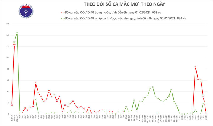 - Tính đến 6h ngày 01/02: Việt Nam có tổng cộng 933 ca mắc COVID-19 do lây nhiễm trong nước, trong đó số lượng ca mắc mới tính từ ngày 27/1 đến nay: 240 ca.