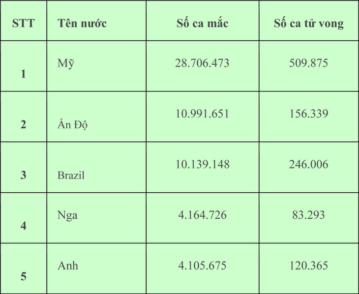 5 quốc gia có số ca mắc COVID-19 nhiều nhất thế giới gồm: