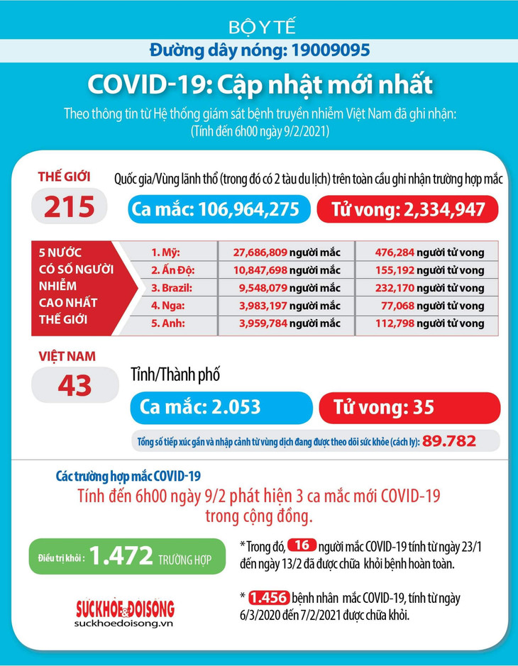 Số ca mắc ở Việt Nam: Tính đến 6h ngày 09/02, Việt Nam có tổng cộng 1163 ca mắc COVID-19 do lây nhiễm trong nước, trong đó số lượng ca mắc mới tính từ ngày 27/1 đến nay là 470 ca. Tính từ 18h ngày 08/02 đến 6h ngày 09/02 có 3 ca mắc mới được cách ly ngay.