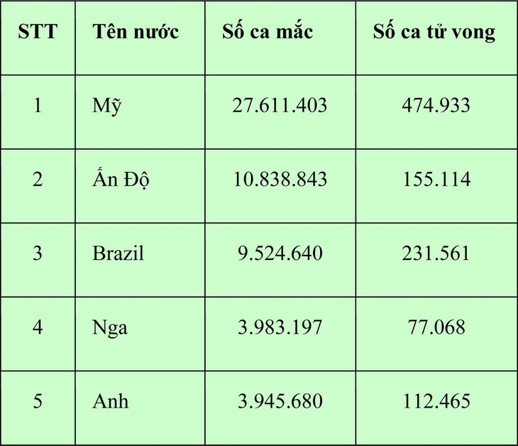 5 quốc gia có số ca mắc COVID-19 nhiều nhất thế giới gồm: