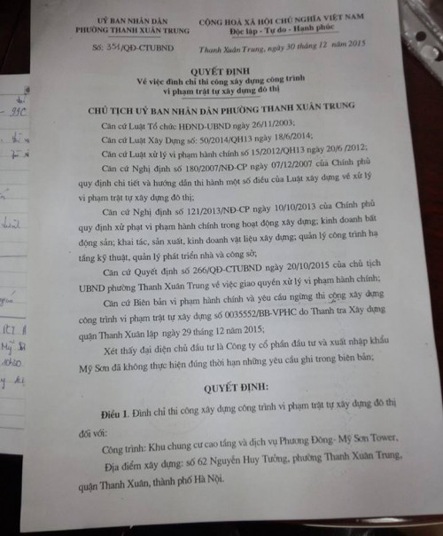 Ngày 30/12/2015, UBND phường Thanh Xuân Trung đã có quyết định đình chỉ thi công đối với công trình 62 Nguyễn Huy Tưởng vì vi phạm trật tự đô thị. Lãnh đạo quận cũng đã tống đạt quyết định tới các đơn vị chức năng để yêu cầu ngừng cấp điện, nước… tới công trình.