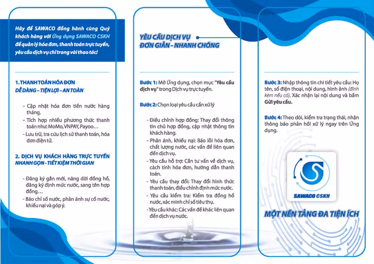 Thông qua nền tảng này, người dùng có thể dễ dàng tra cứu thông tin sử dụng nước, theo dõi lịch sử thanh toán, hóa đơn điện tử, nhận thông báo chỉ số và số tiền nước hàng tháng. Ngoài ra, ứng dụng còn cho phép thanh toán trực tuyến qua nhiều hình thức tiện lợi, phản ánh chất lượng nước, gửi yêu cầu dịch vụ, tra cứu lịch cắt nước hoặc tình trạng sửa chữa đường ống tại khu vực sinh sống.