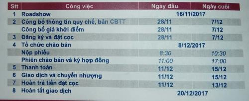 Ngày công bố thông tin quy chế, bản công bố thông tin, giá khởi điểm, đăng ký và đặt cọc dự kiến sẽ diễn ra từ ngày 28/11 đến 7/12. Giá đặt mua không thấp hơn giá khởi điểm và mức giá sàn của cổ phiếu VCG tại ngày chào bán. Số lượng cổ phần đặt mua tối thiểu 5.000. Bước giá 100 đồng, bước khối lượng 10 cổ phần.
