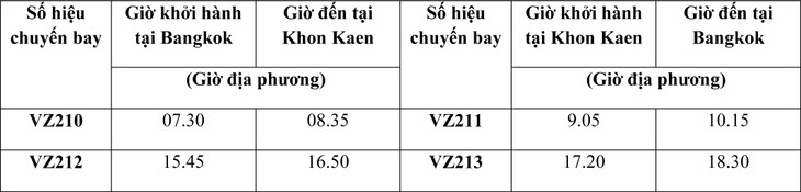 Đường bay mới khai trương Bangkok - Khon Kaen là đường bay thứ 7 được khai thác từ đại bản doanh Suvarnabhumi của Vietjet Thái Lan. Đường bay sẽ được khai thác 2 chuyến mỗi ngày, thòi gian bay 1 giờ 5 phút cho mỗi chặng với lịch bay như sau: