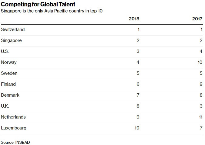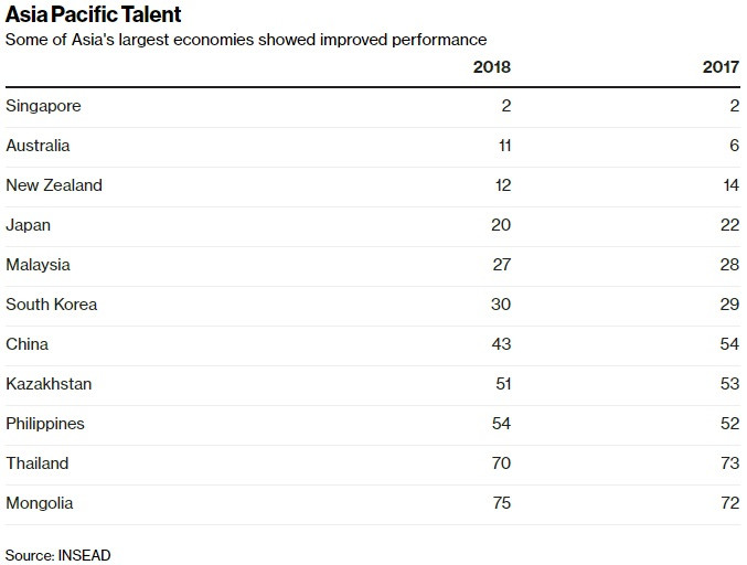 Theo INSEAD – trường kinh doanh sau đại học hàng đầu thế giới, Singapore đứng ở vị trí thứ 2 sau Thụy Sỹ về Chỉ số Canh tranh Nhân tài Toàn cầu, và là quốc gia duy nhất của châu Á lọt vào top 10. Australia đứng hạng 6 năm ngoái đã rơi xuống vị trí thứ 11, trong khi New Zealand đứng ở vị trí 12.